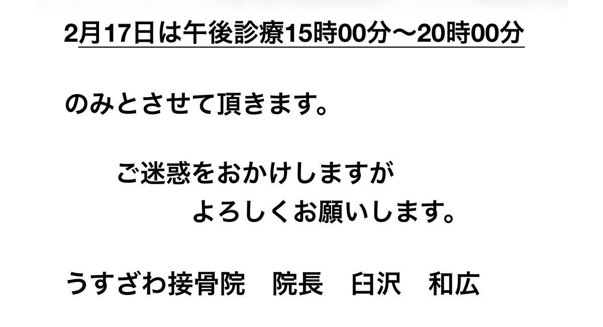 R8 2 ・17の診療時間変更のお知らせ | お知らせ | 葛飾区でおすすめの接骨院は、お一人お一人丁寧に症状に合わせ治療をさせて頂きます